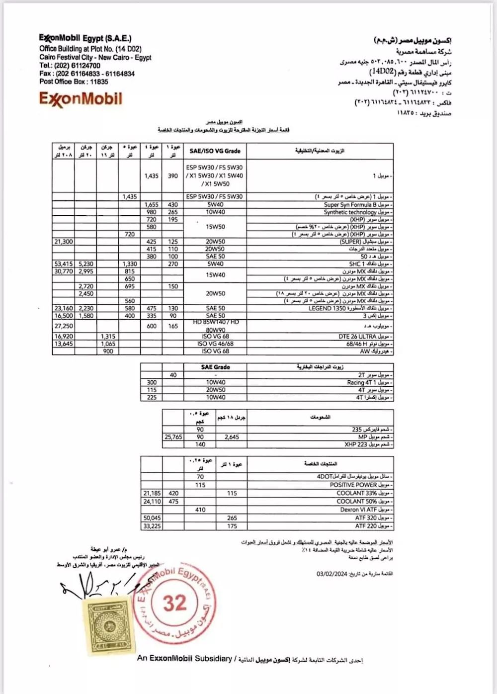 وخاطبت الشركة شبكات موزعيها بأنحاء الجمهورية، بقوائم الأسعار المقترحة لبيع التجزئة بمختلف المحافظات، وأوزانها وأنواعها سواء المخصصة لمحركات البنزين أو الديزل، والهيدروليك والمنتجات الخاصة، يمكن التعرف على الأسعار الجديدة لمنتجات موبيل من خلال القائمة التالية: